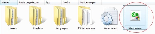 Sollte der Autostart nicht funktionieren, so öffnen Sie bitte mit dem Windows Explorer das (neue) CD ROM Laufwerk und starten StartMe.exe per Hand: