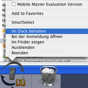 Mobile Master erscheint im Dock. Um diesen dort fest aufzunehmen (also das Sie vom Dock aus bequem Mobile Master starten können), klicken Sie mit der rechten Maustaste (oder Ctrl+Maustaste) auf das Mobile Master Icon im dock und wählen 'Im Dock behalten'.